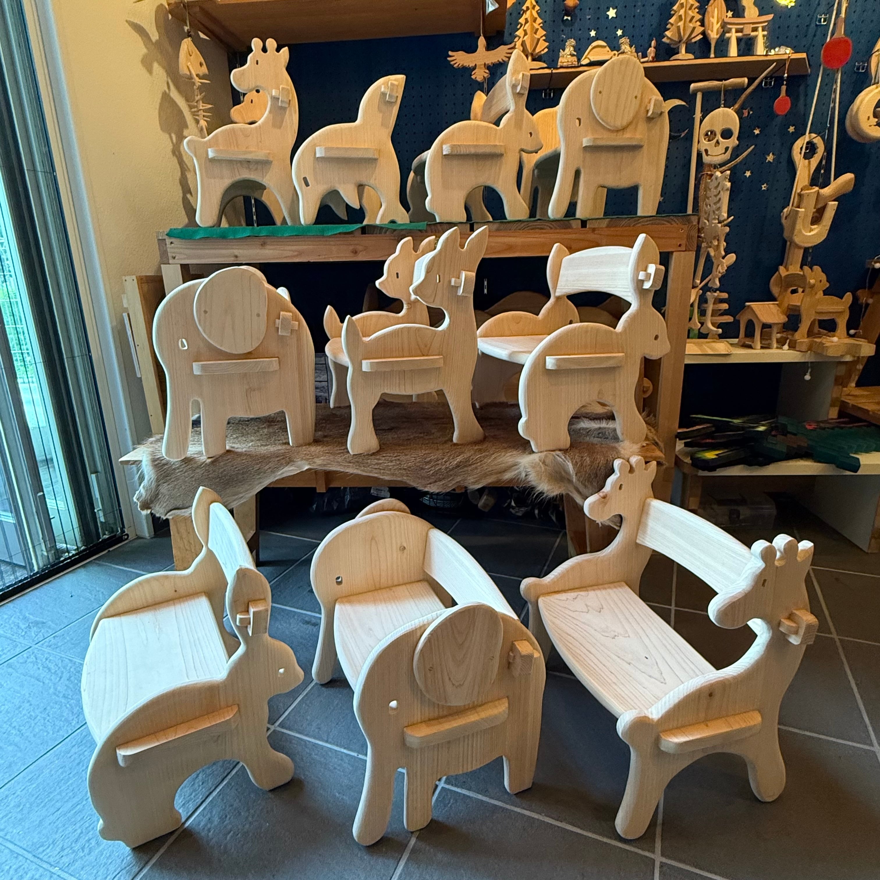 少し大きめのキッズチェアです、樹齢50年近くするヒノキの一枚板を使って作成しております。こちらの製品は貴重な材料を使っているので制作に時間がかかる場合があります。