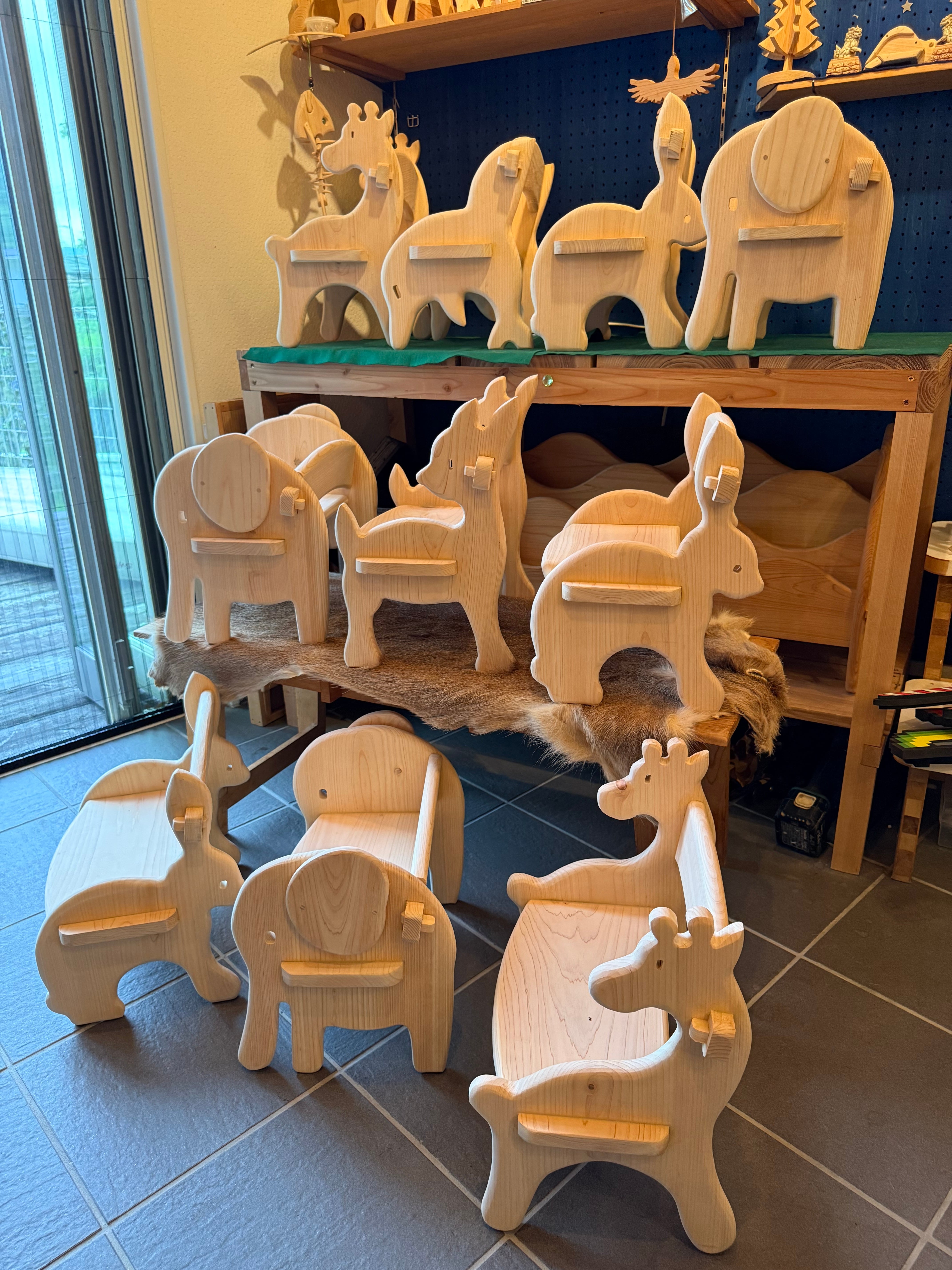 少し大きめのキッズチェアです、樹齢50年近くするヒノキの一枚板を使って作成しております。こちらの製品は貴重な材料を使っているので制作に時間がかかる場合があります。