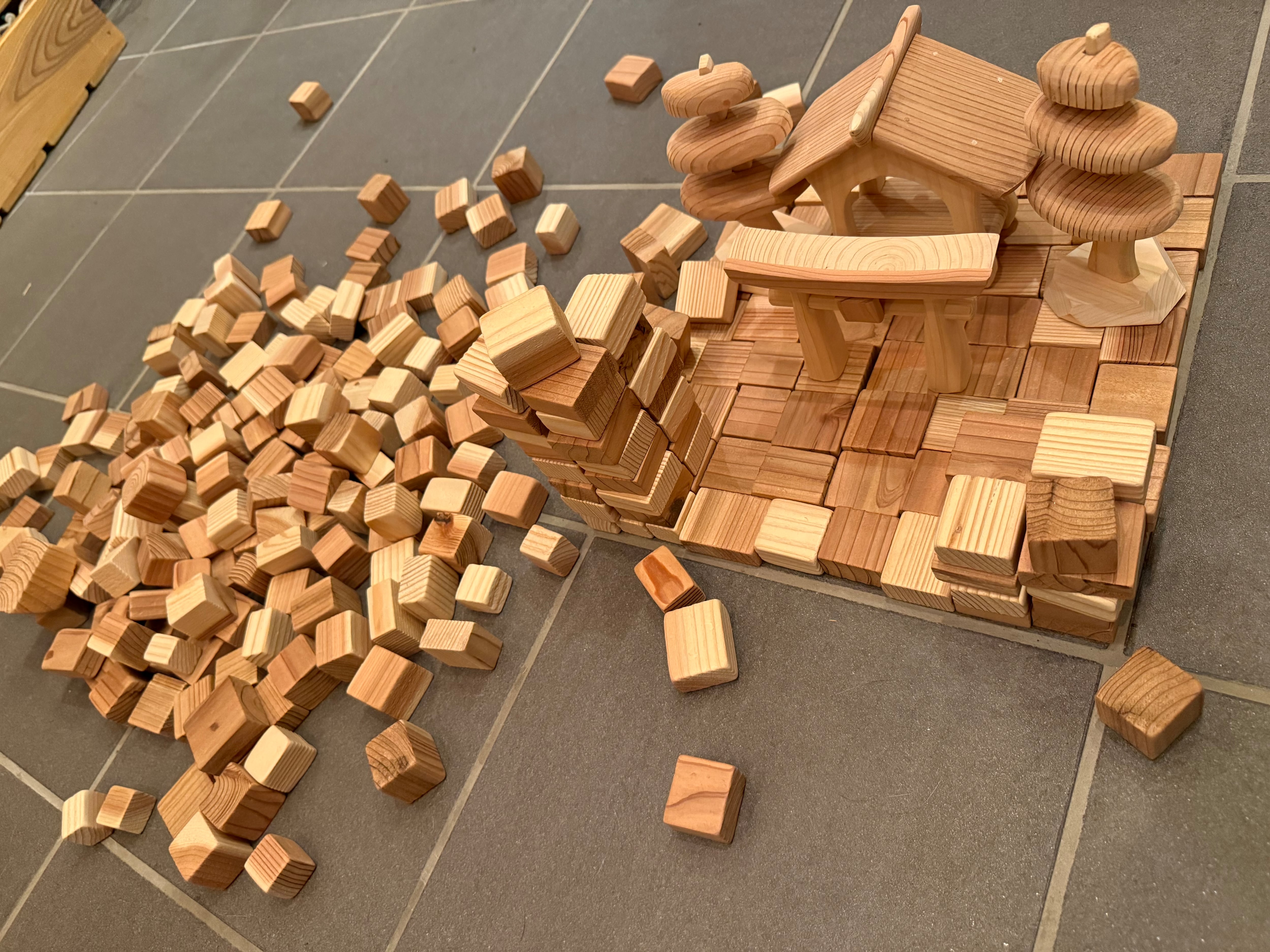 simanto工房の杉の積み木は、幅約3cm、300ピースほどで、総重量は約3㎏の業務用です。業務用ですがプレゼントや宝箱にもセッティング可能です、プレゼントにも良いですし店舗の飾りや素材としてもお使いになれます。環境イベントなどで配ったり出来ます。