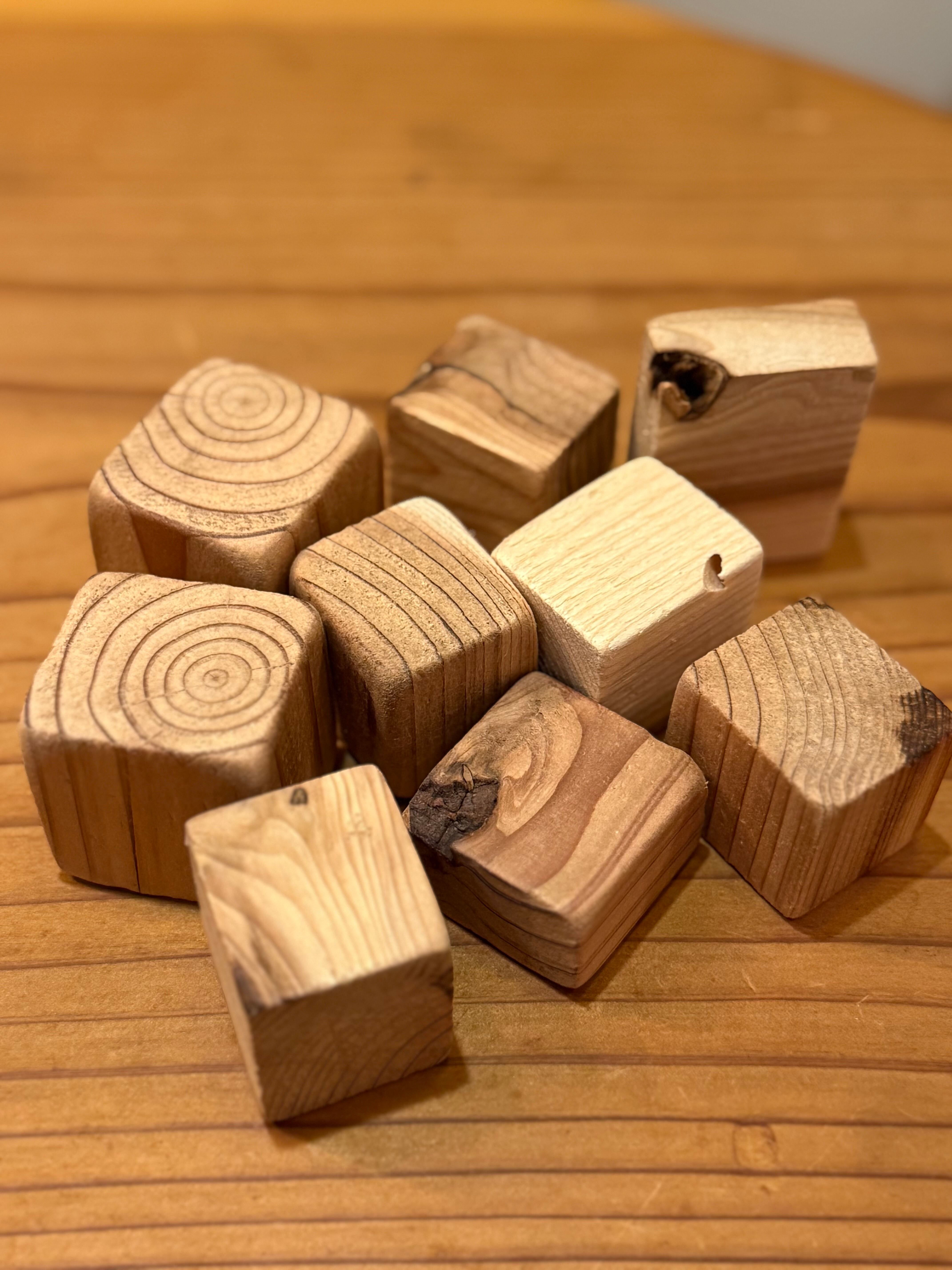 市場にはツルツルに磨かれた積み木が数多くありますが、私たちの積み木は「素」の魅力を大切にしています。あえて自然のままの風合いを残し、節やウロ、傷や割れ、まれに小さな虫食い穴(虫はいません)が見られることも。それらは木の個性であり、本物の証です。表面は滑らかながら、木目がほのかに浮き出る仕上げにこだわりました。触れるたびに木の温もりを感じ、目で見てその独特な表情を楽しめます。時には木の芯や中心の木目が現れるピースもあり、一つひとつが異なる物語を持っています。この積み木は、木の個性と自然の美しさを五感で感じる特別な体験をお届けします。あなたの手で、目で、その魅力をぜひ感じてください。